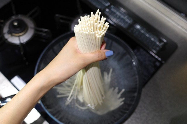 たっぷり湯を沸かし、乾麺を茹でようとしたのだが、初っ端からアクシデントが。麺が長くて約37㎝あり、うまく鍋(記者は大きめのフライパンを使用)に入らないのだ。