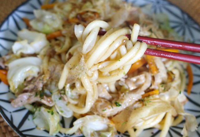 具材を炒めうどんをドボンして、焼うどんが完成。見た目通り、食感もスーパーで売っている茹でうどんのようだった。茹でたてよりも麺が柔らかくなって、これはこれで美味しい。
