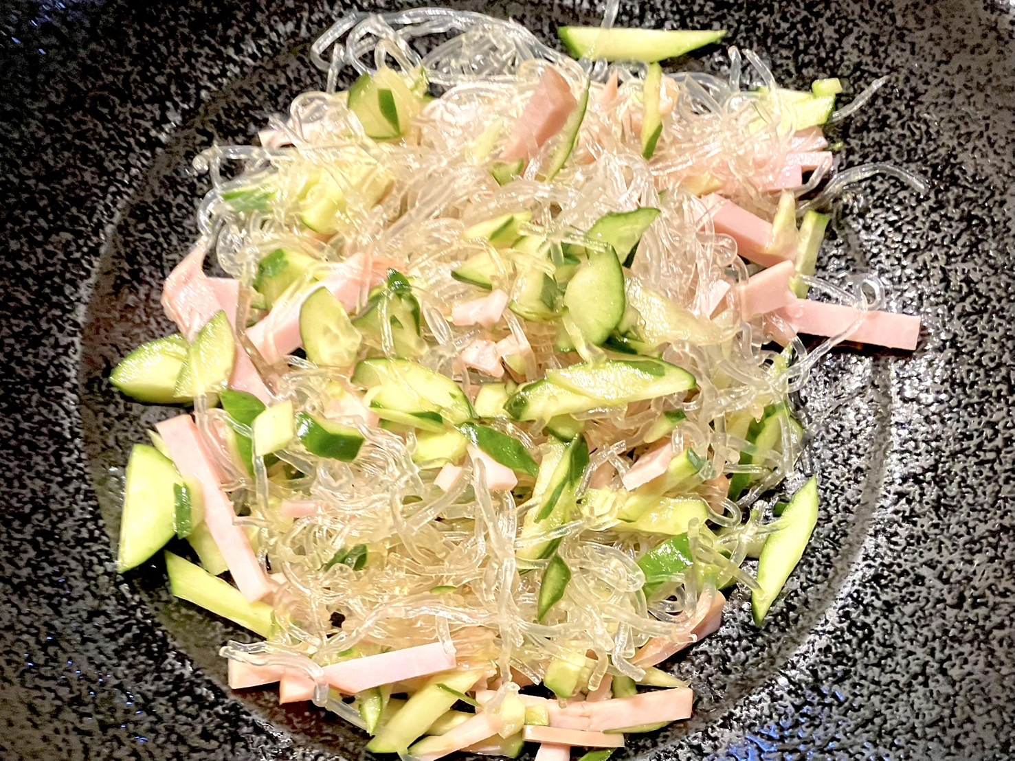 続いてきゅうりとハムを混ぜて、春雨サラダ風にしてみた。