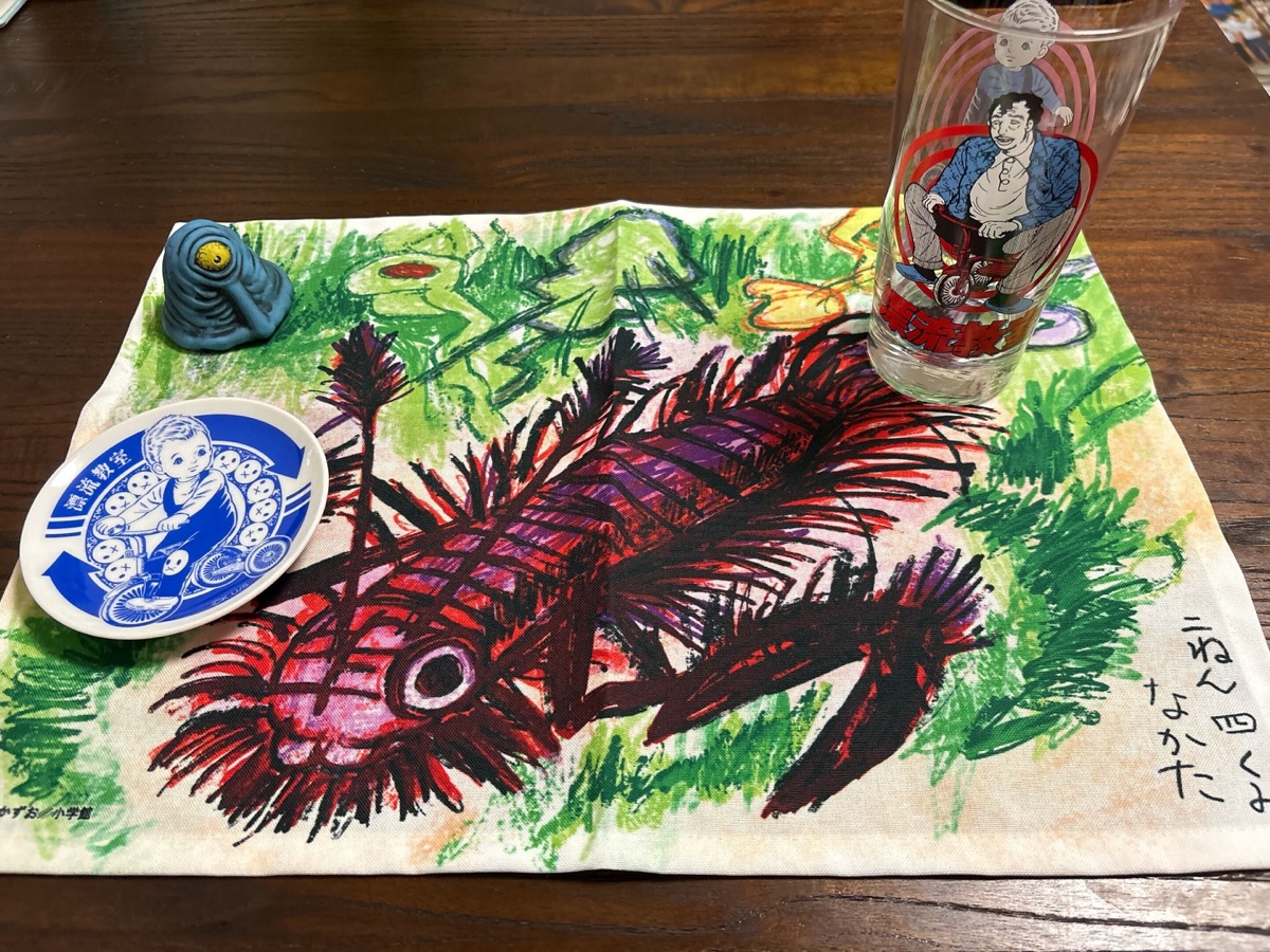 ▲帰宅後、購入したランチョンマットにユウちゃんの豆皿、劇中最大のヒールである関谷とユウちゃんのグラスを並べてみたが……やっぱり食欲は湧いてこない。が、『漂流教室』の世界観には浸れる。