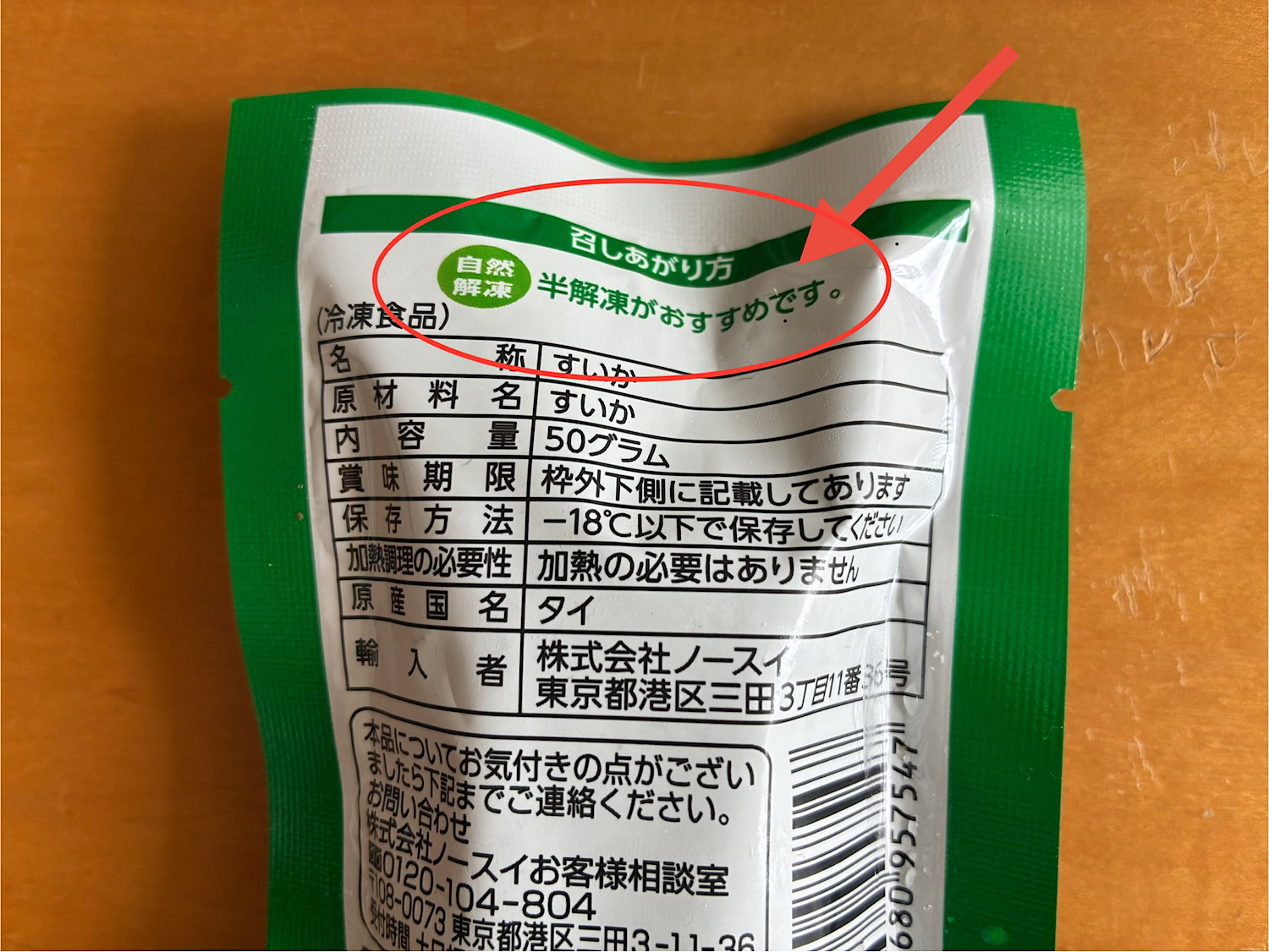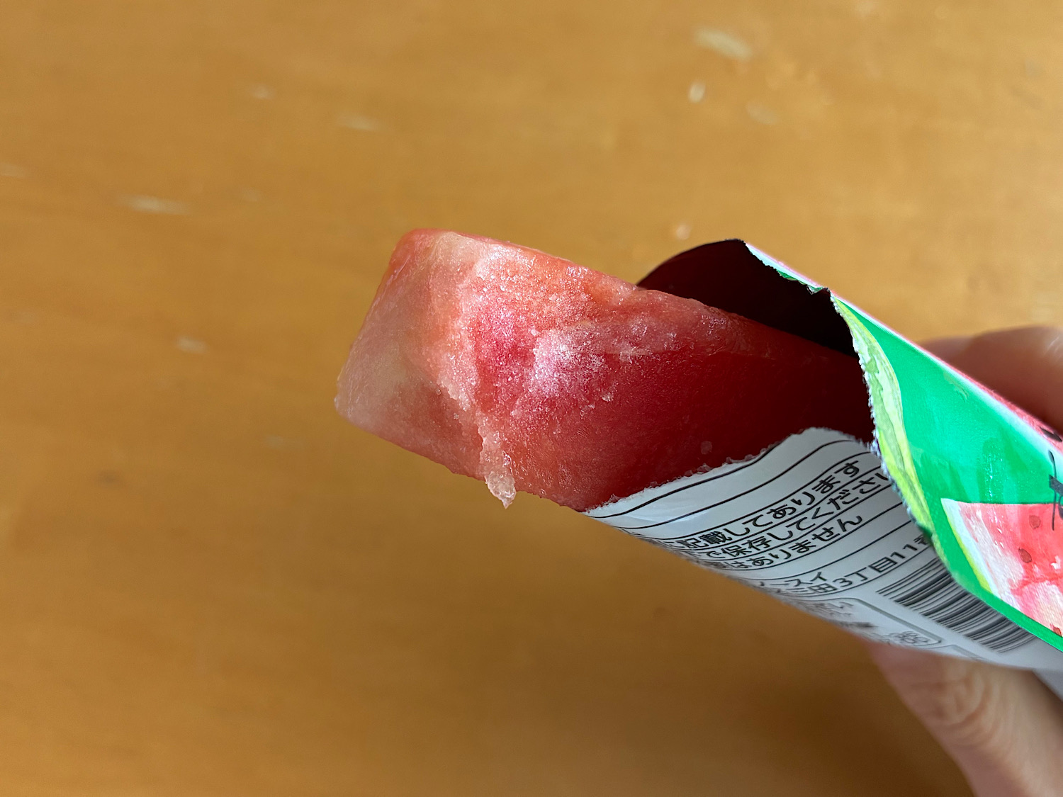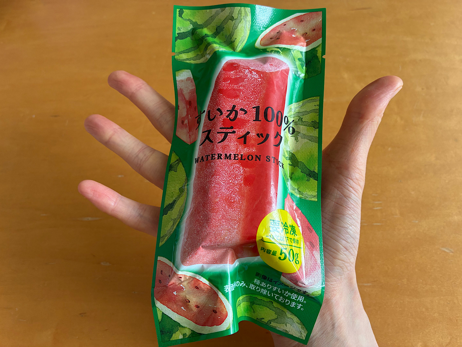 スイカバーのパチモン的なやつだろうか。しかしそれならアイスケースに入っていそうなものである。ということはガチで冷凍のすいか? え、すいかって冷凍できたっけ……?