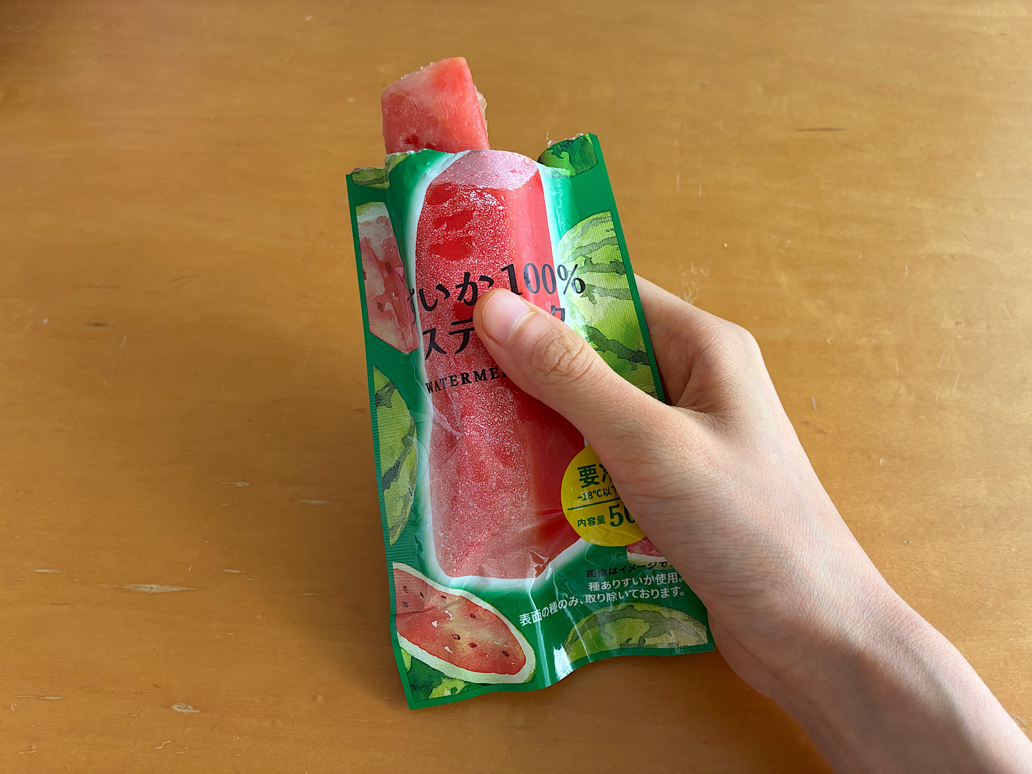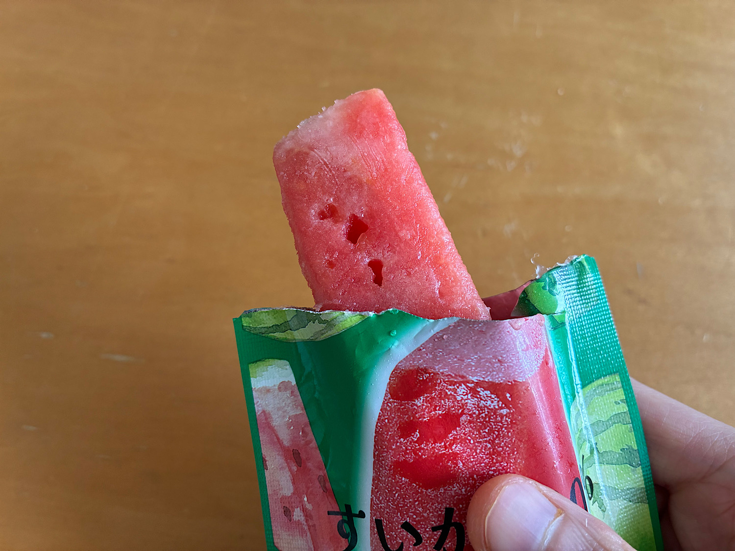 普通にすいかを食べるのとどっちが好きかと問われれば申し訳ない、余裕で普通のすいかなのだが、これはこれでアリだ。ワンハンドで食べやすく、きめ細かい氷みたいな食感も面白いし、なにより爆速で体が冷える。