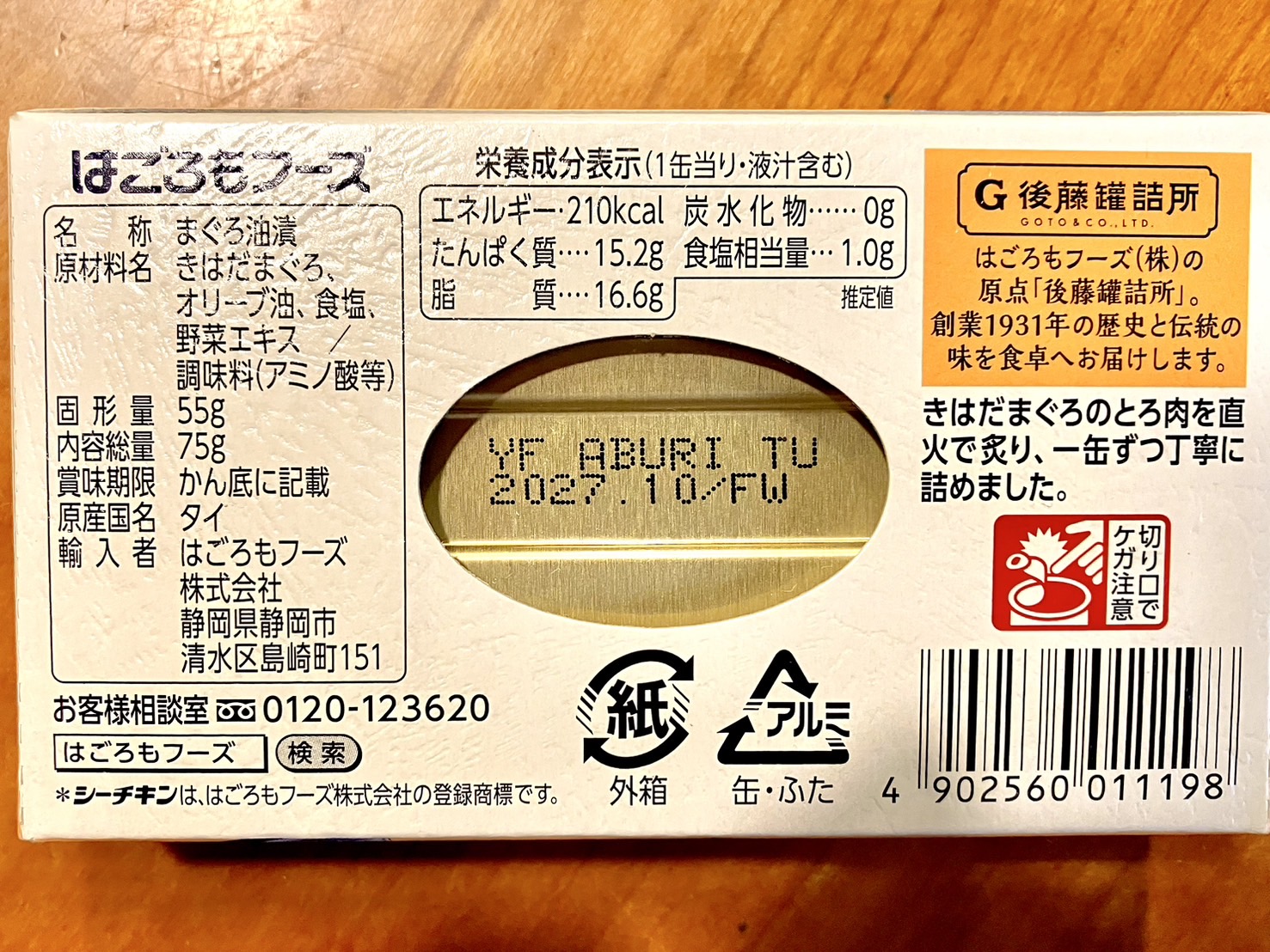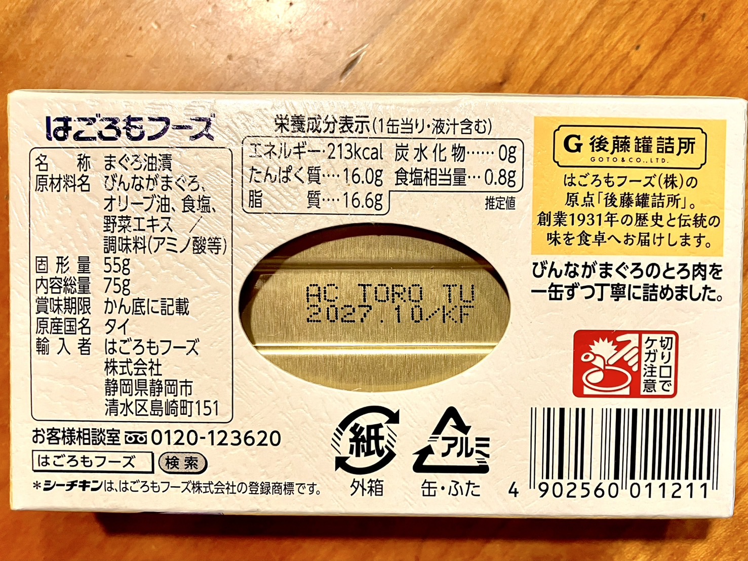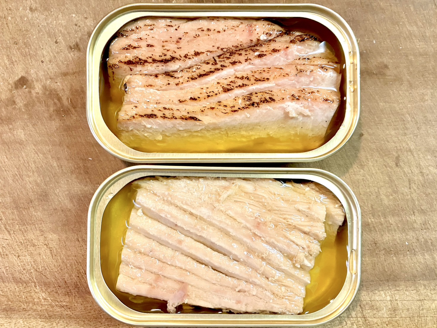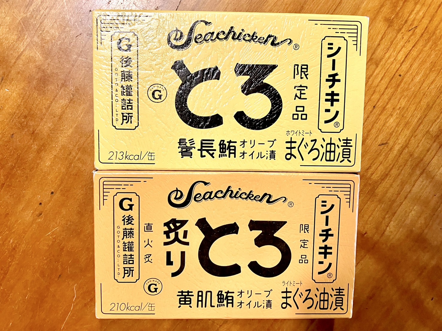 今回購入したのは後藤罐詰所の「シーチキンとろオリーブオイル(びんなが)」と「シーチキン炙りとろオリーブ漬け(キハダ)」。