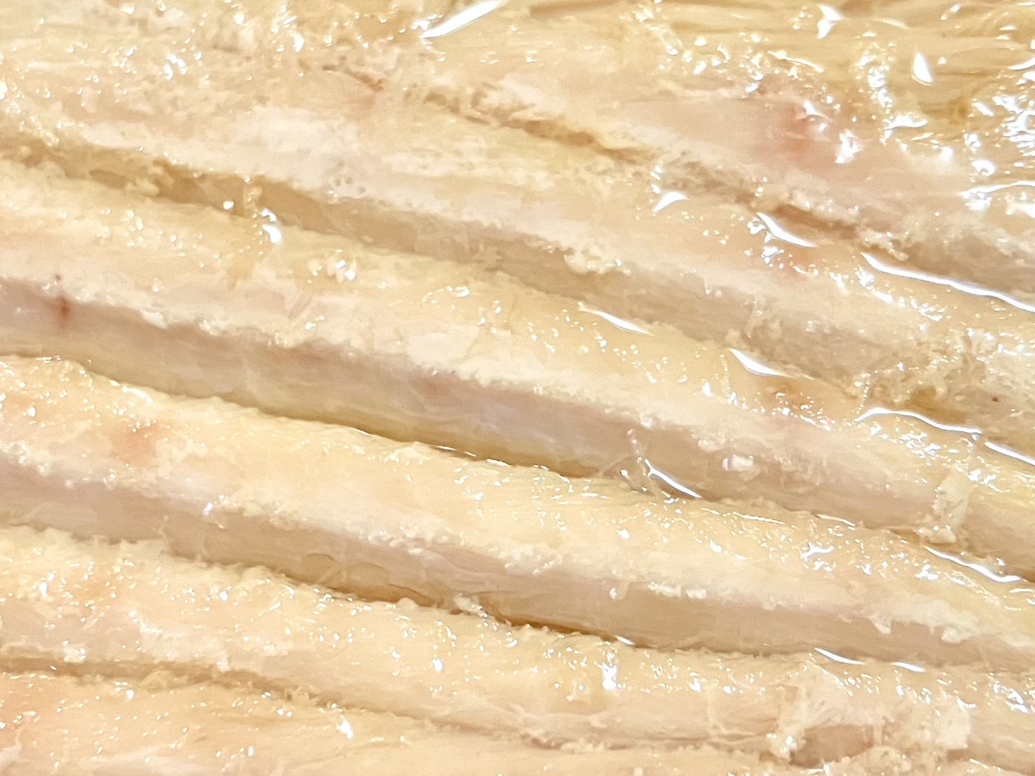 缶の中から取り出してみるとこんな感じ。まずは「シーチキンとろオリーブオイル(びんなが)」から食べてみよう。