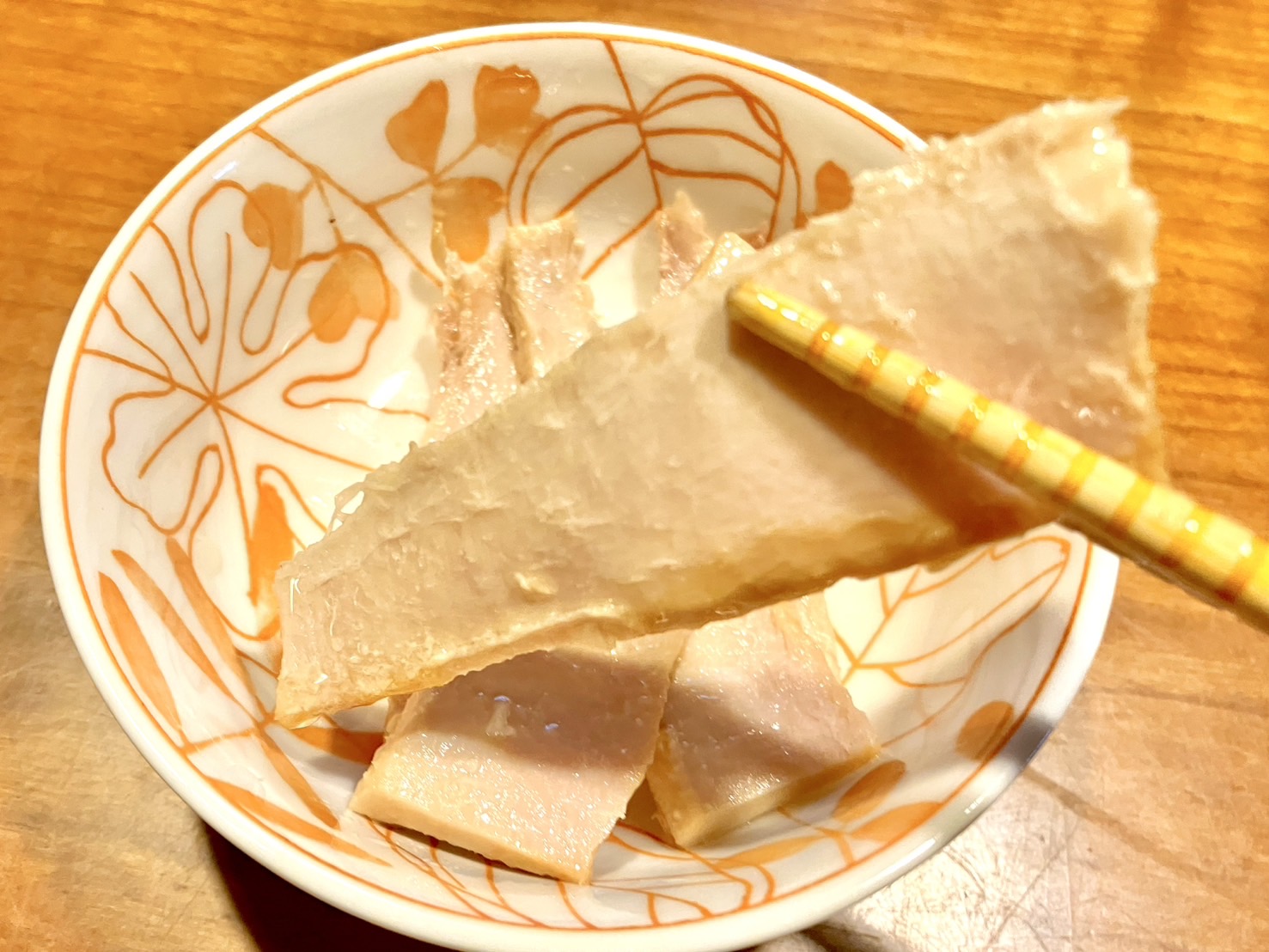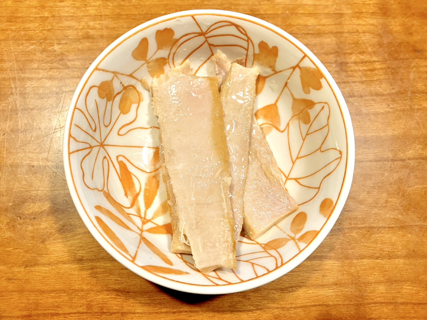 お皿に盛りつけた時に「スモークチキンに似ている見た目だな」と思ったけど、食感もそれに近かった。
