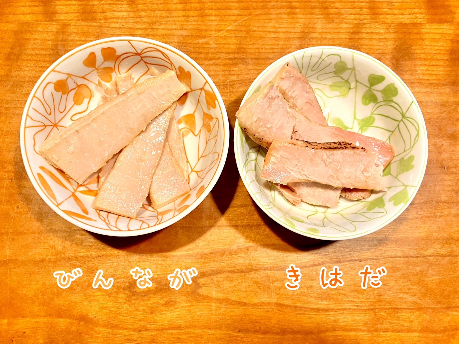 中に入っているツナは、どちらも薄い板状だ。普段食べているツナ缶はフレーク状のものがほとんどなので、このタイプのツナを食べるのは初めて。