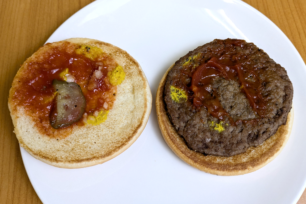 で、それぞれをバラします。改めてハンバーガーを開いてみると、殺風景だな~……。バンズにパティしかない。それにピクルスが1枚とケチャップ・マスタード、オニオンが散らしてあるだけ。