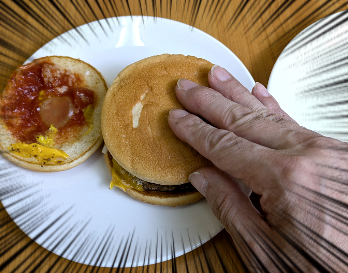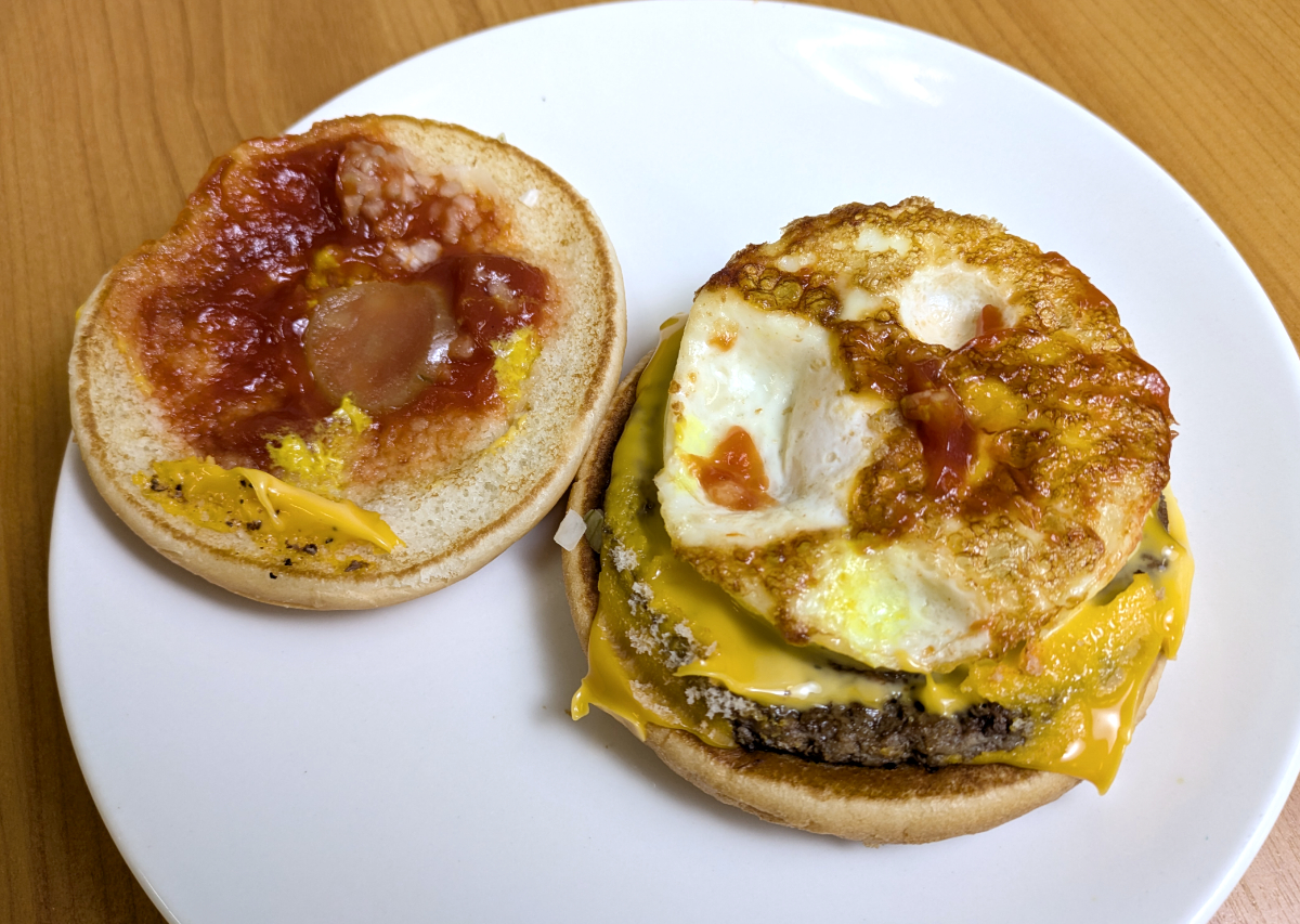 仕方ない、これは自分で作れというメッセージだろう。そう解釈した私は、ハンバーガー(税込190円)とエグチ(エッグチーズバーガー:税込250円)を購入してきた。