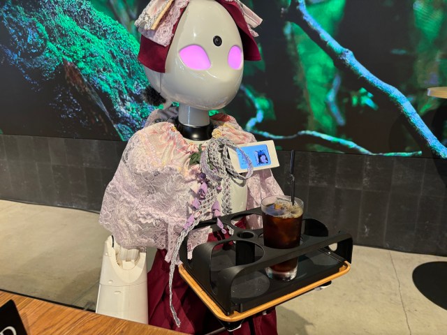 OriHimeがゆっくりと席に近づいてきて、「おまたせしました〜」と、ドリンクを持ってきてくれる様子、和む。