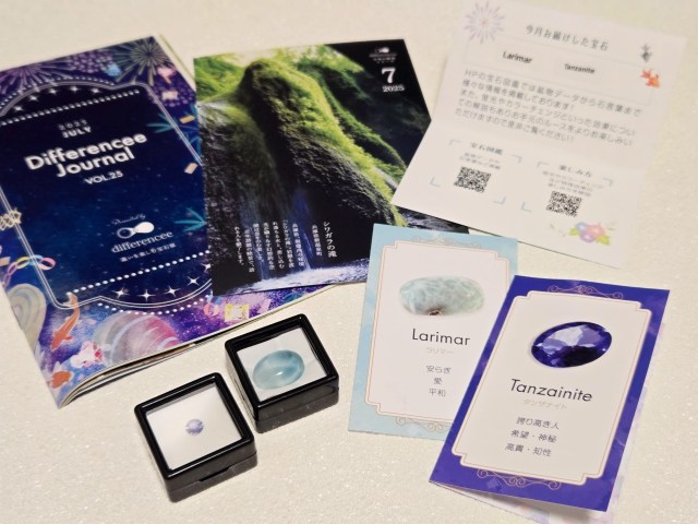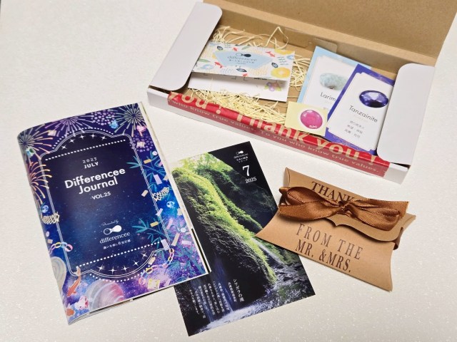 さっそく開封していこう! 中には宝石が入っている小包と、「Differencee Journal」の冊子、ポストカード、宝石カードが入っていた。