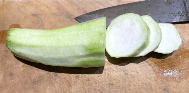 手で持ったヘチマは、フワフワとしている。もっと硬いと思っていたので、驚いた。ピーラーで皮をむくと、白い面が見えてきた。どのように切るのが正解かわからなかったが、思い切って輪切りにしてみる。