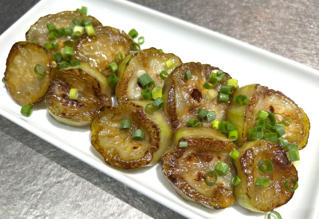中心に種が詰まっているようで、ゴーヤに似ている。油を引いたフライパンに並べて、柔らかくなるまで焼いていく。火を通すとかなりクタッとなるのだが、弾力もありそうで、ちょっとやそっとでは崩れることはなさそう。