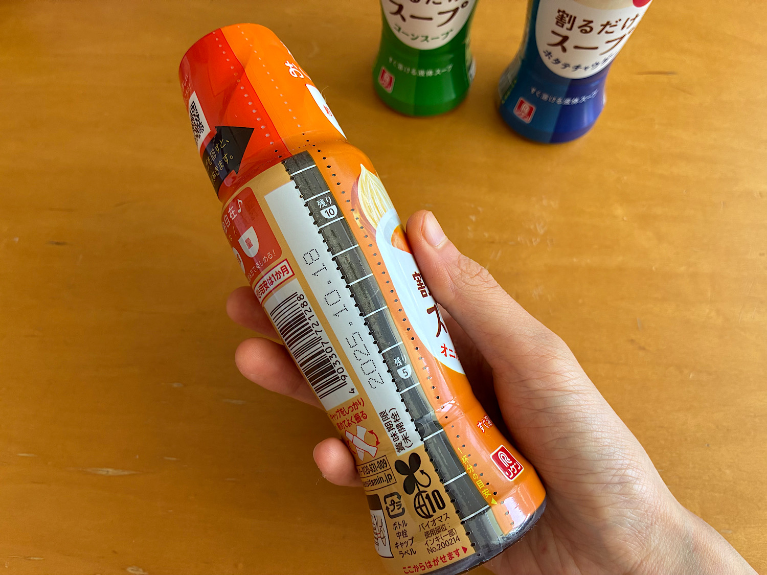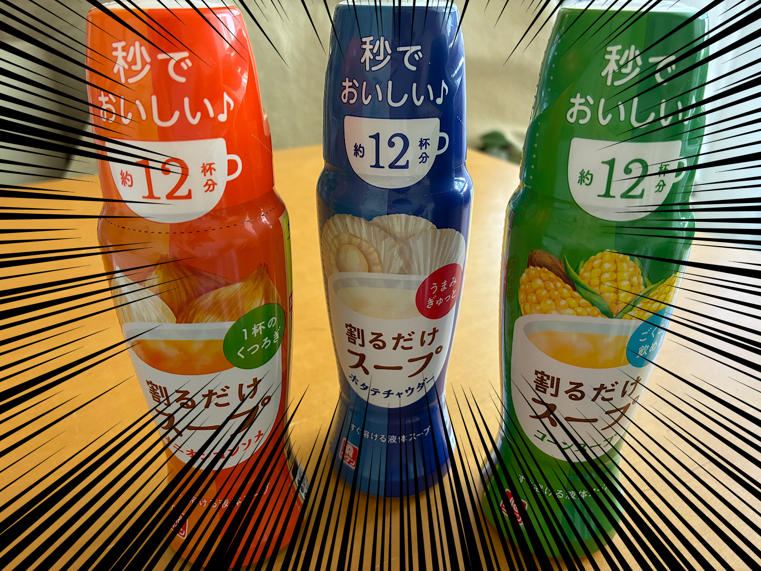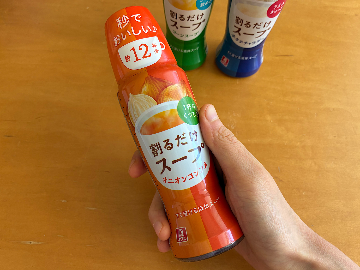 というわけでこちらが「割るだけスープ」シリーズ。ラインナップは「オニオンコンソメ」「コーンスープ」「ホタテチャウダー」の3種で、各300円ほど。