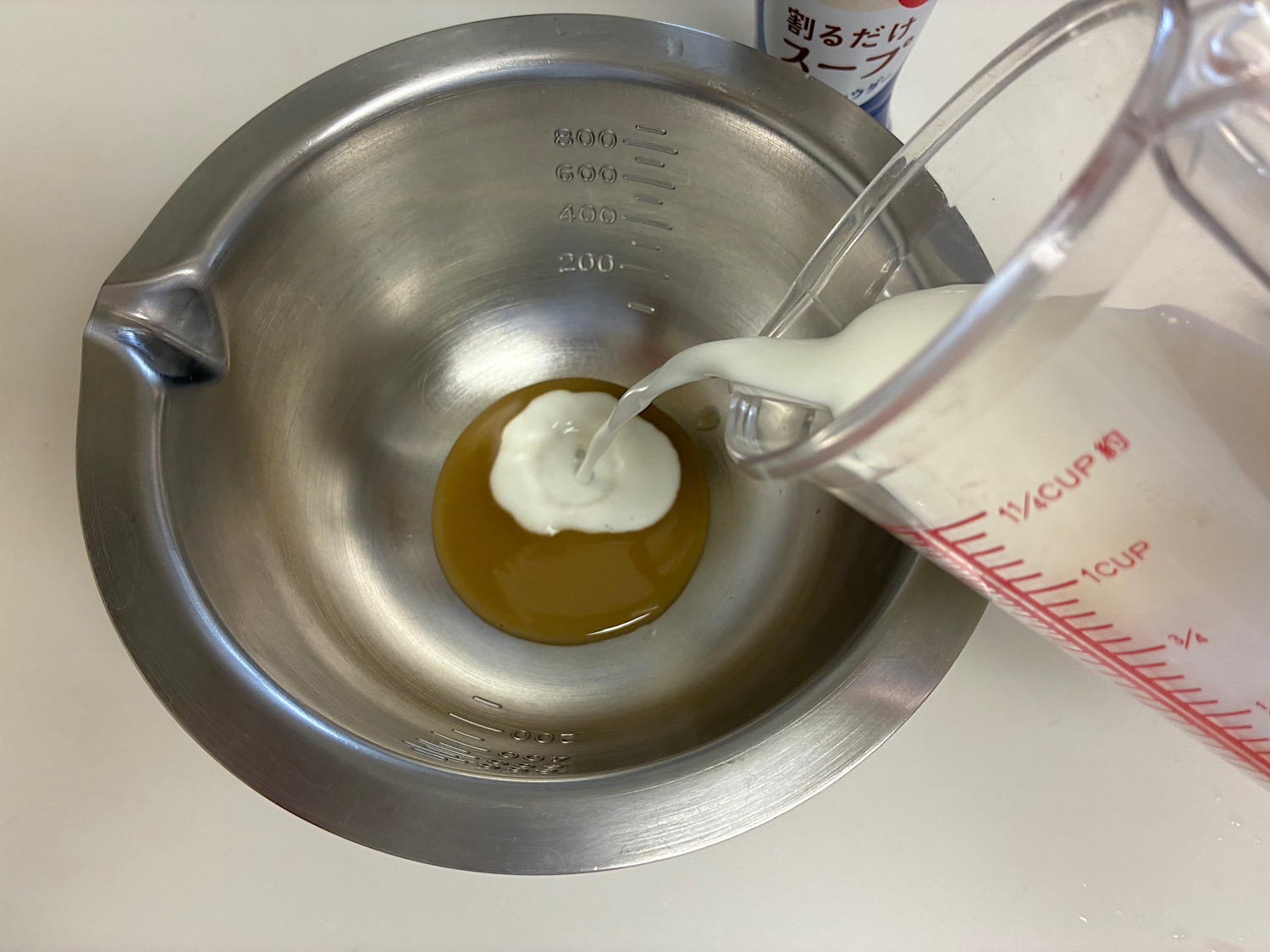まず「ホタテチャウダー」を牛乳で溶いておく。
