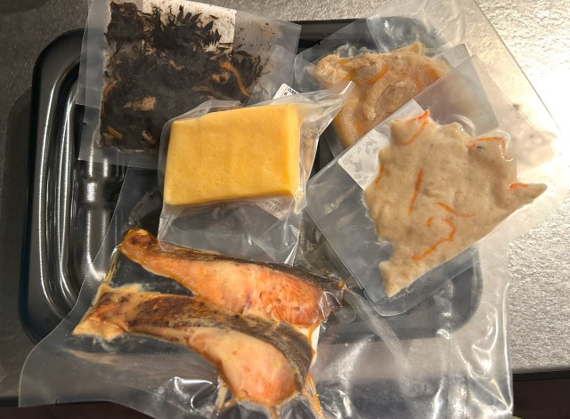 「西京焼きおかずセット」の中身は銀鮭西京焼き2切・玉子焼き4切・ひじき40g・おから40g・千切大根40g。西京焼きと玉子焼きは湯せんまたはレンチンすればOKで、そのほかも流水で解凍すればすぐに食べられる。