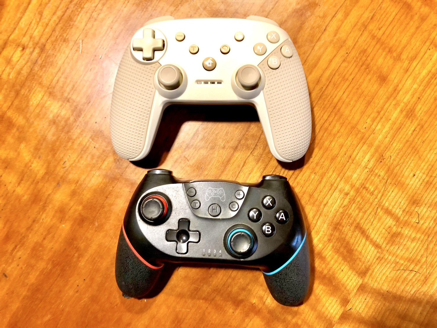 筆者が普段から使っているAmazonで購入した税込2899円のコントローラーと並べてみるとこんな感じ。十字ボタンの位置が違うだけで、大体似たような構造だな。