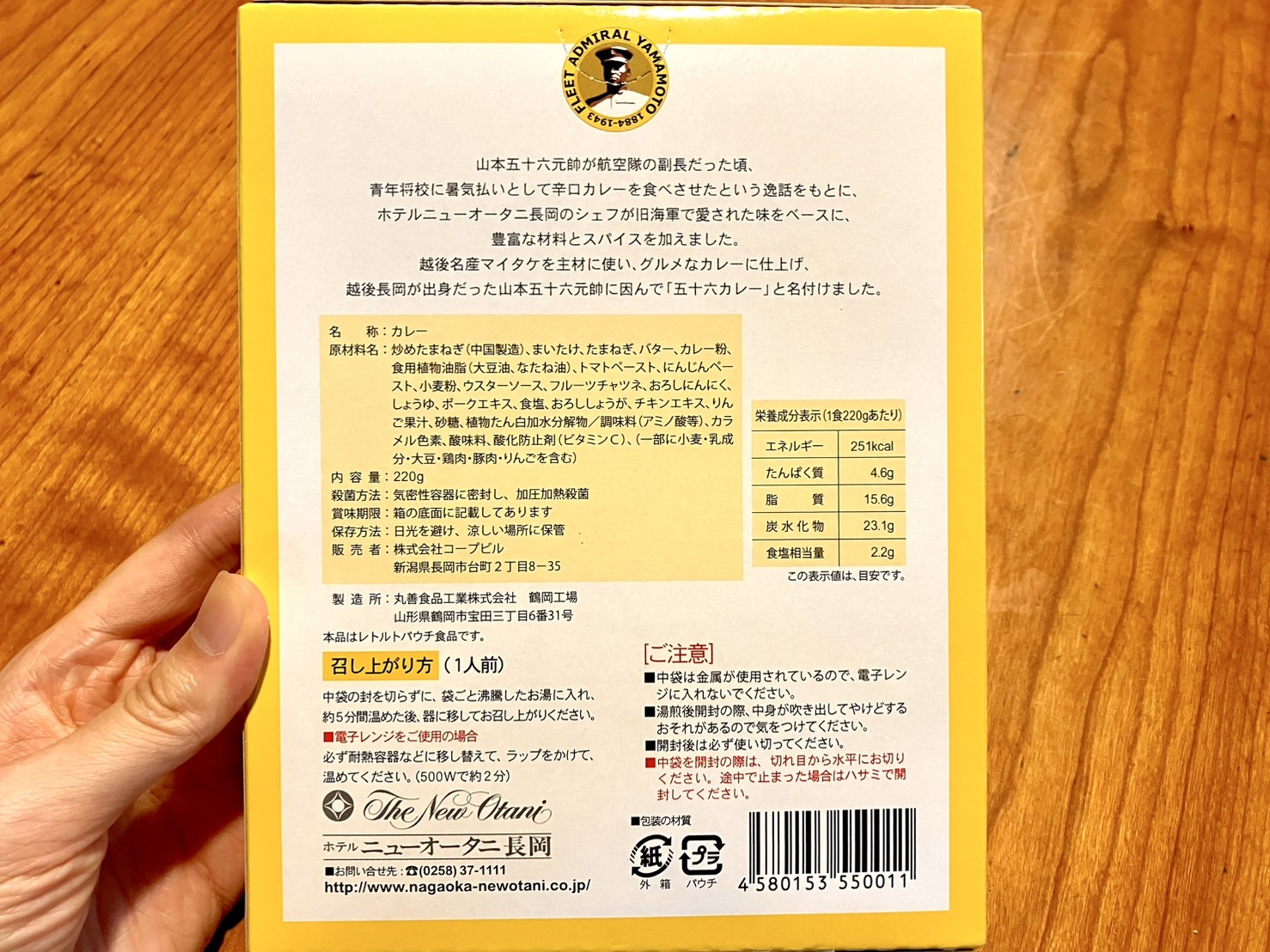 この旧海軍で愛されたカレーの味をベースに「ホテルニューオータニ長岡」のシェフがアレンジを加え、商品化したものが五十六カレーだそうだ。