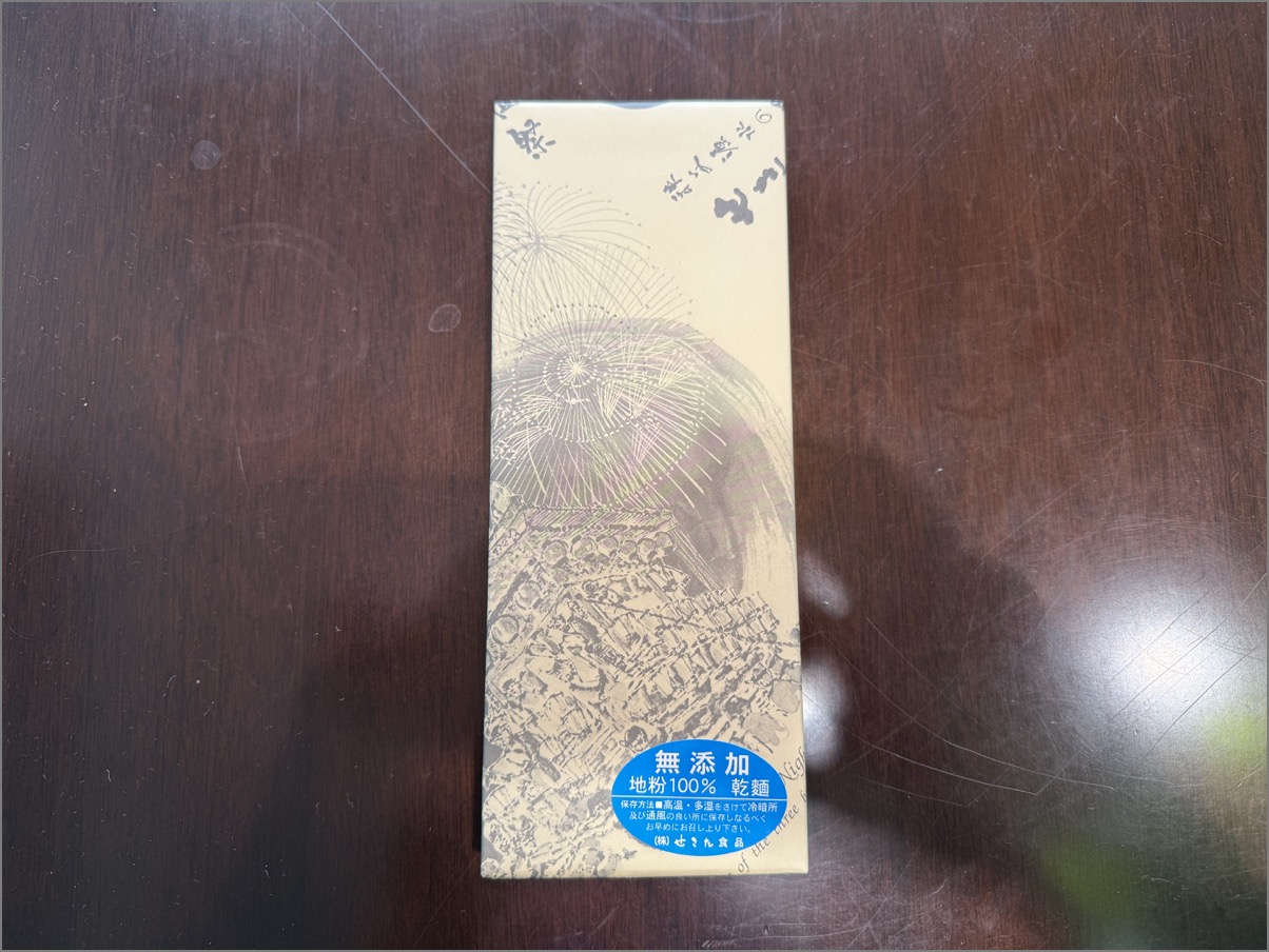 「無添加 地粉100% 乾麺」とのラベルが貼ってある包装紙を剥がしてみると……
