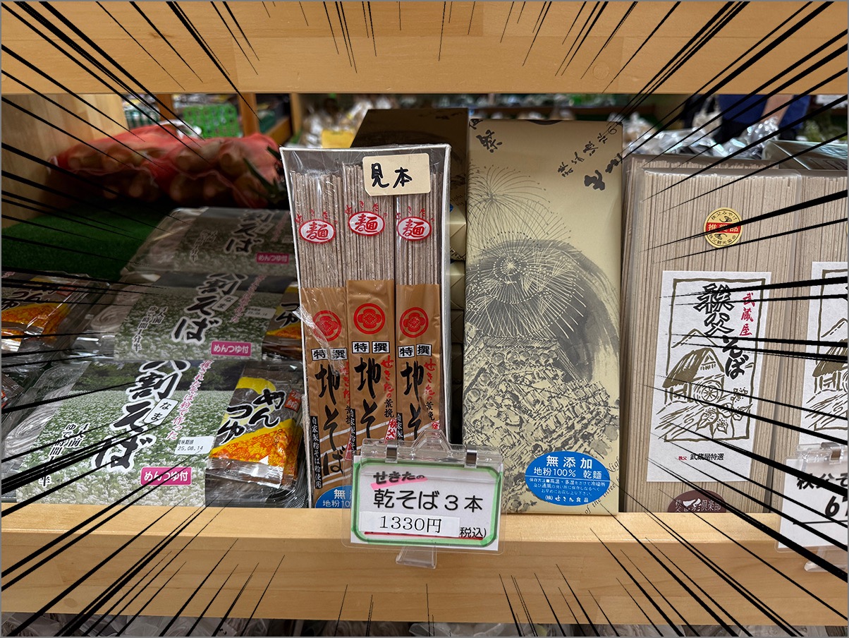 道の駅「果樹公園あしがくぼ」の物販コーナーを見ていたら、ひときわ豪華な包みの干し蕎麦が売られていた。ゴージャスに包装されている箱の蕎麦で、なんと価格は1330円!