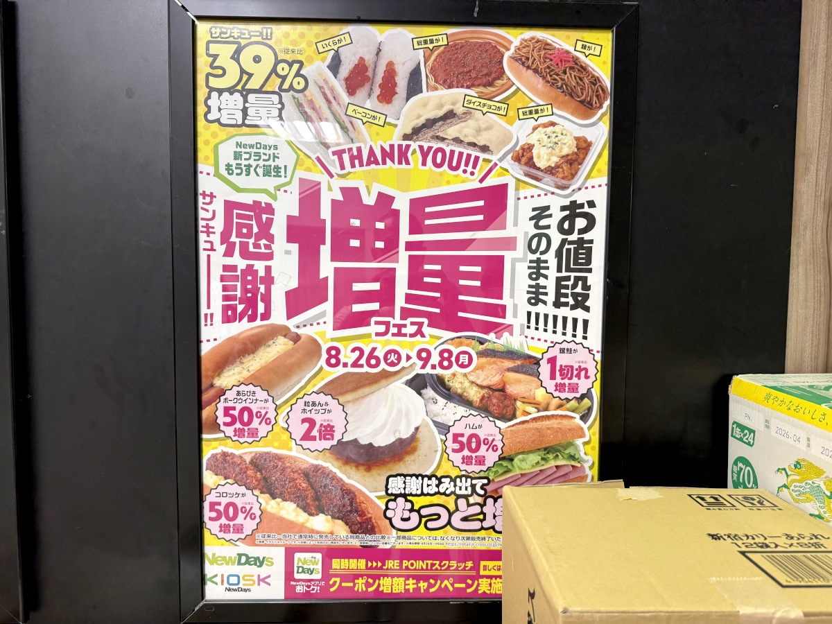 ボソボソと小声で失礼します。2025年8月26日からJR東日本エリアの駅なかコンビニ・NewDays(ニューデイズ)で『増量フェス』が始まりました。他のコンビニと比較すると目立たない存在かもですが、意外と優良なキャンペーンなんです。