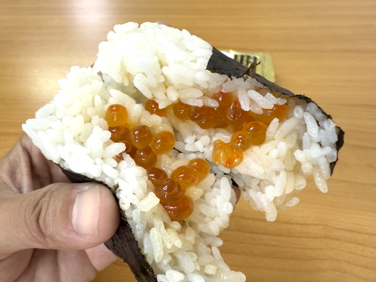 逆に評価が難しかったのが、いくらの量が39%増量になった「いくらのおにぎり(298円)」でしょうか。中身の具は正直「こんなもん?」といった感じ。あふれんばかりのいくらを期待していましたが、そういうことではありませんでした。