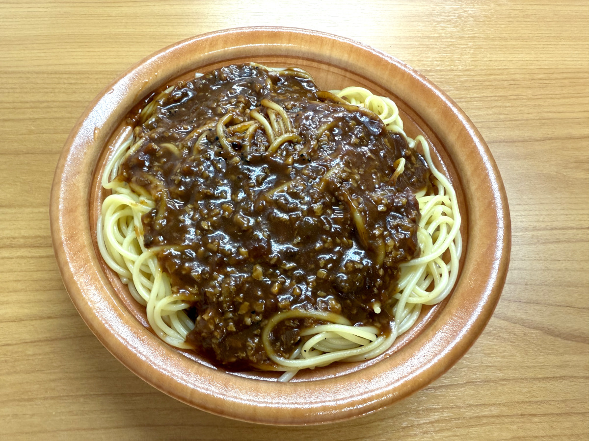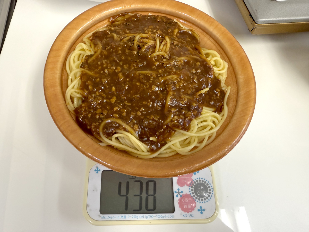 まず「最も良かった商品」は、総重量が39%増量になっている「ミートソースパスタ(480円)」です。容器込みの重さは438グラムで、ワンコインでこれは良コスパ。味は可もなく不可もなく普通に美味しいミートソースでした。