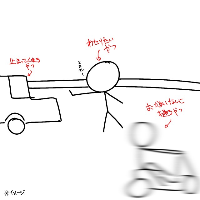 適当な場所で、車を止めるかのように車のある方に手を向ける。こうしたら大体は止まってくれるのでそのまま歩いて道路を渡る。