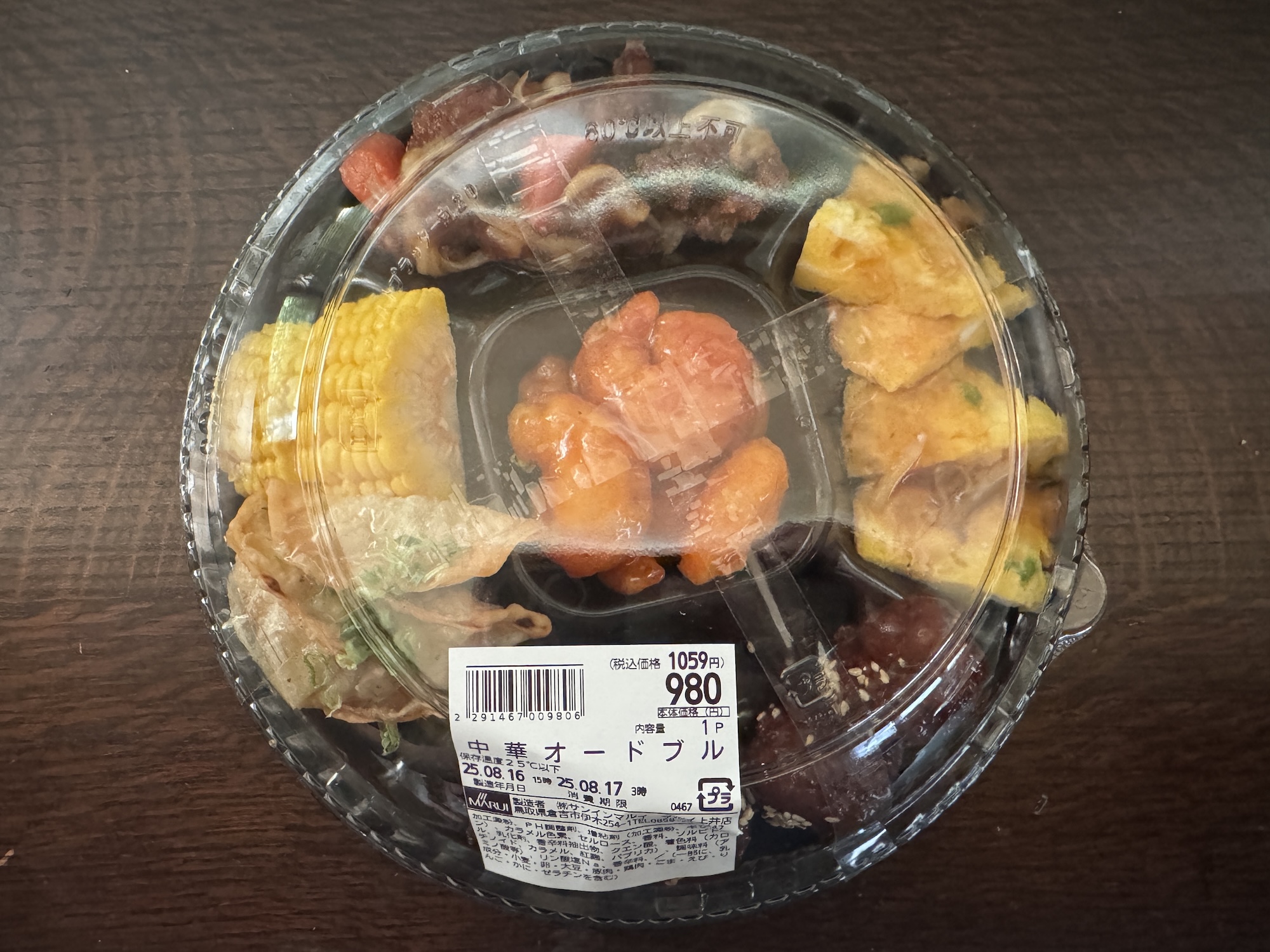ひっそり『中華オードブル』(税込1059円)が売られているのを発見したぞ!!!! あまりにコンパクトサイズなうえ、盆関連商品なのかどうか定かじゃない。そもそも半額どころか1円も値引きされていない。
