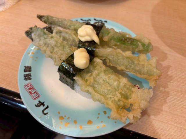 友人に勧められた「アスパラ天ぷら(143円)」も予想以上に美味しく、衣のサクサク感とアスパラの甘さが絶妙だった。