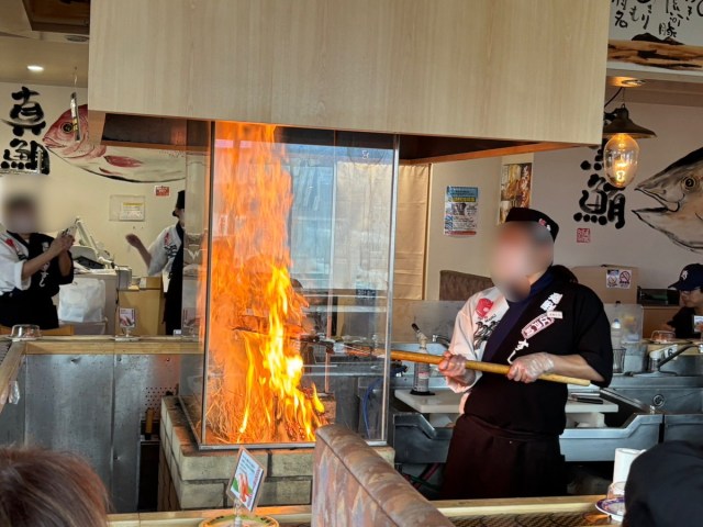 カツオの藁焼きパフォーマンスの始まりだ。勢いよく炎が立ち上がり、店全体が盛り上がる。