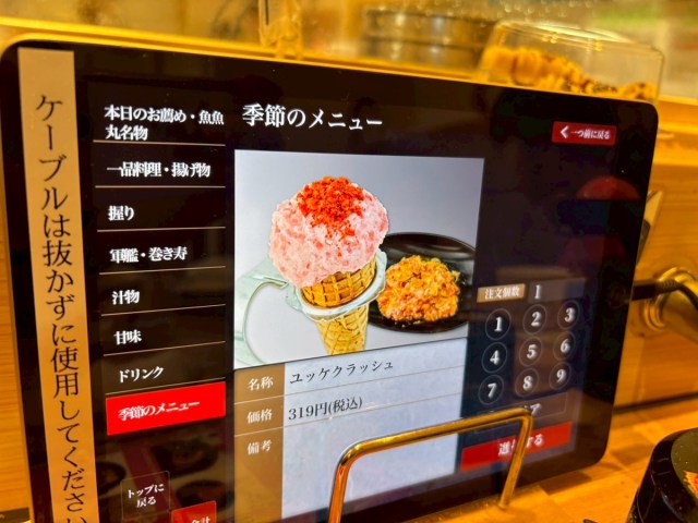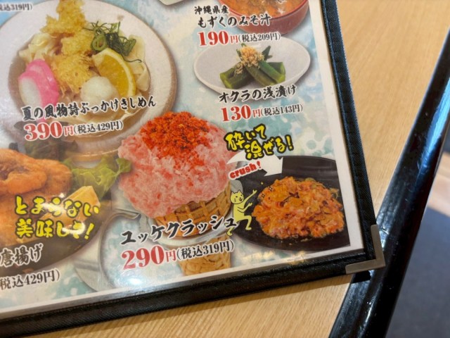 通常メニューに加えて夏メニューが並び、なかでも強烈な存在感を放っていたのが「ユッケクラッシュ(319円)」だった。