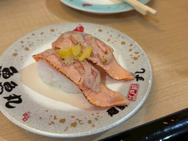 「サーモンの味醂粕炙り刻みゆず乗せ(319円)」は味醂(みりん)粕の甘みと炙りの香ばしさにゆずのアクセントが加わり、記憶に残る一皿だった。