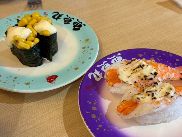 子どもたちが好きな「コーンマヨ軍艦(143円)」「炙りえびマヨチーズ(286円)」もやや大きめでおいしい!