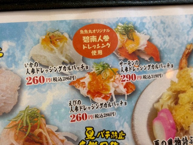 さらに、魚魚丸らしいご当地感のある一品として「えびの人参ドレッシングカルパッチョ(286円)」を注文。
