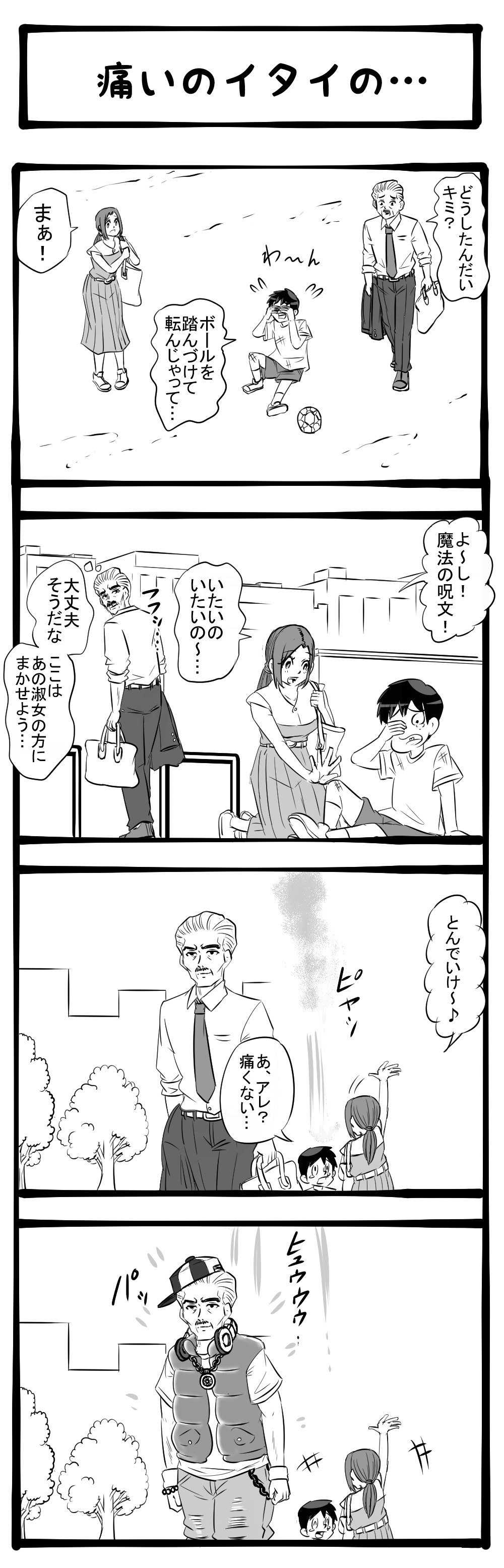 今から商談やねんぞ! 魔法の呪文が被弾する紳士! 四コマサボタージュBYD第180回「痛いのイタいの…」