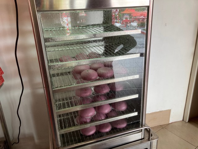 真っ赤なモスクの前にある真っ赤なレストランだが、名物はなんと「さつまいも」。さつまいもアイスとさつまいも蒸しパンが売っている。赤色なのには紫色なんだ。