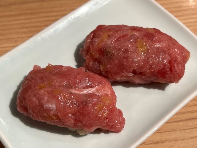 まぐろのおはぎ(2貫385円)。おはぎのように、ご飯(シャリ)をトロタクで包んだメニューらしい。