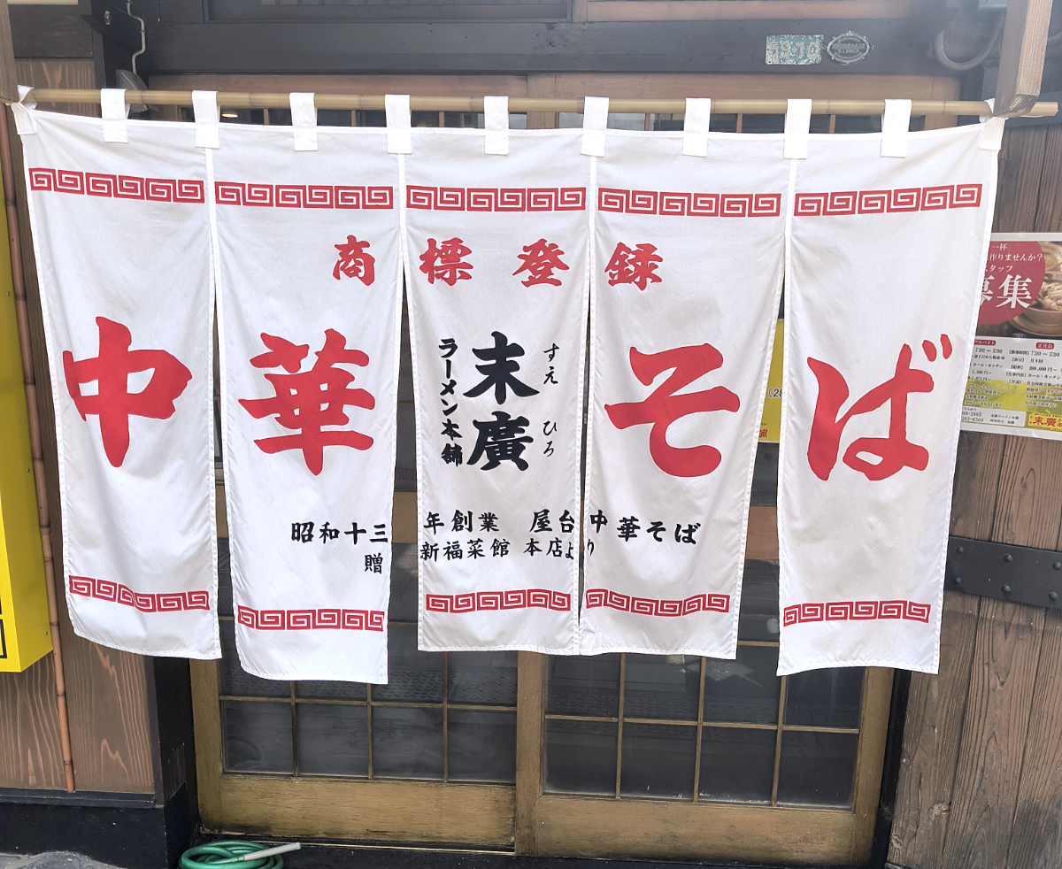 入口の暖簾には「昭和13年創業 屋台中華そば」と書かれており、その下に「贈 新福菜館本店より」と記載されている。実は末廣ラーメン本舗の創業者は、新福菜館で修行してその味を継承して、東北で合う形に改良したそうだ。公式サイトにはこうある。