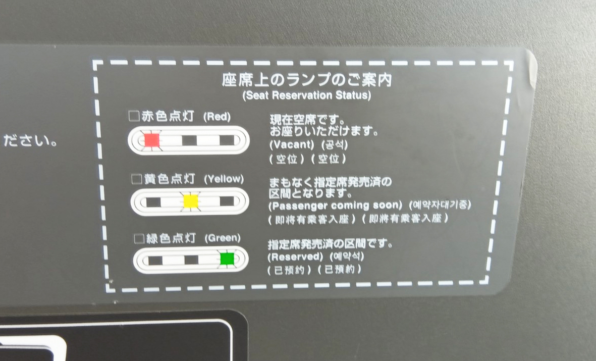 そこでまずは座席のランプとやらを確認してみたところ、確かに座席の上に赤とか緑に光るランプがついている。アナウンスによると、赤に光ってる時はその席を指定してる人がいない区間、黄色がもうすぐ指定された区間に入る合図、そして緑が指定している人がいる状態なのだとか。
