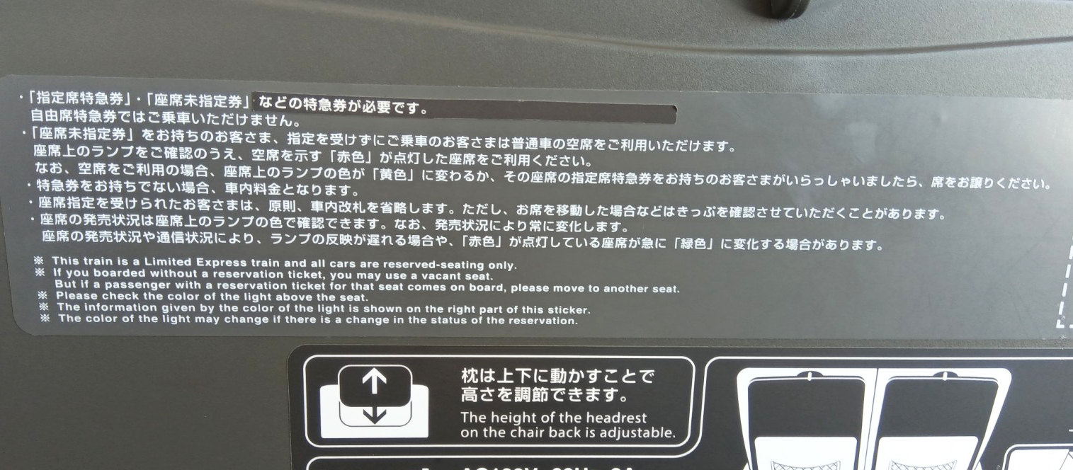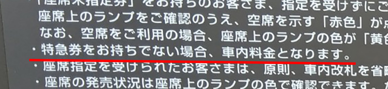 「指定席特急券をお持ちでないお客様はデッキか座席の赤いランプの席をご利用ください」──。え? どういうこと? 指定席特急券ないと乗れないんじゃないの? お持ちじゃないお客様が乗ってるのおかしくない? しかも、座席に座れるの??