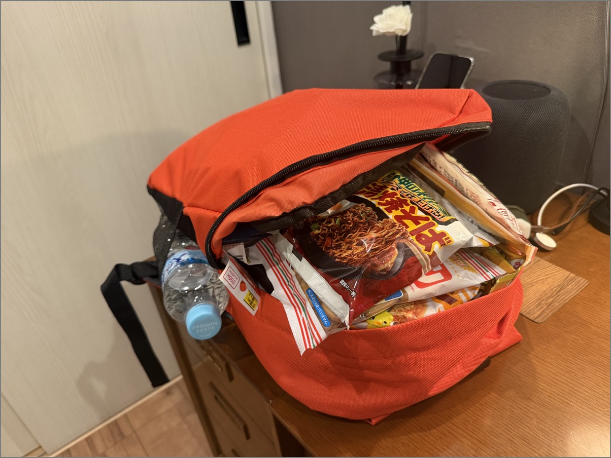 これらもすべてダイソーで揃えた。水は取り出しやすい550mlと、調理などにも使える2リットルをダブルで用意。食べ物は即席ラーメンを軸に、カンパンや羊羹(ようかん)など、非常食として定番の品もフォローしておいた。なお、いわゆる “カップ麺” は、かさばるので却下。登山やキャンプばりに調理する前提だ。