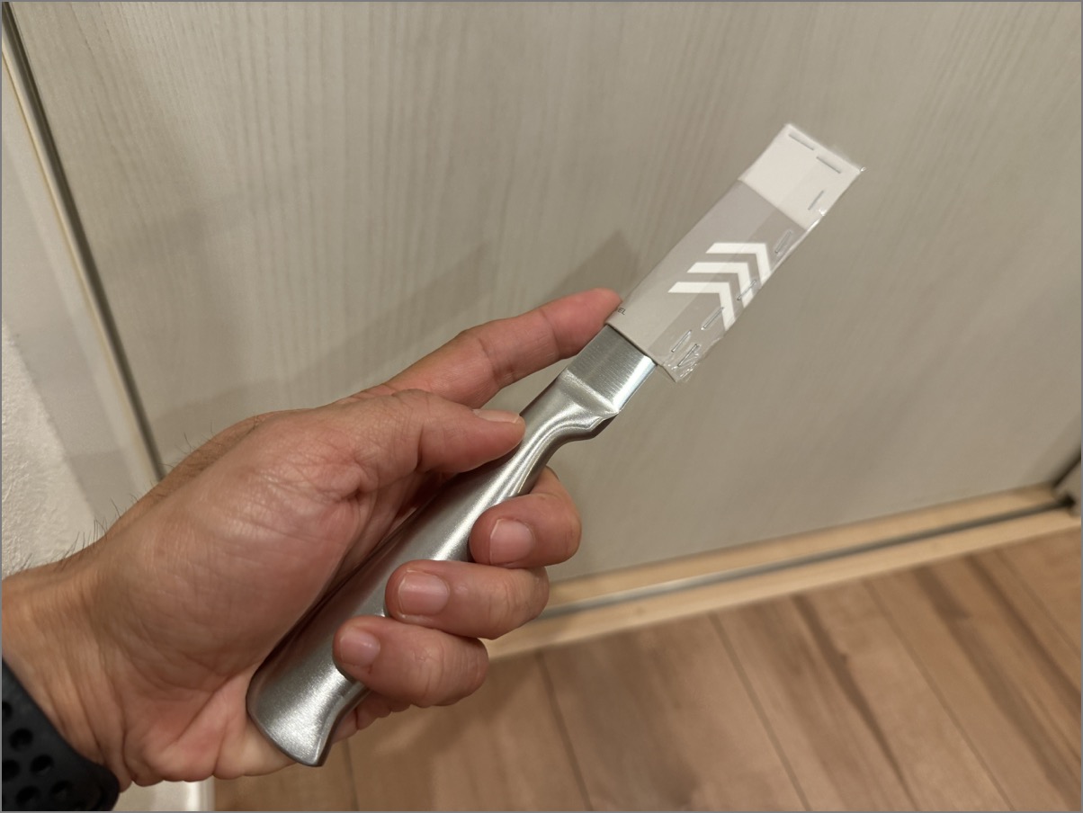 ▼ナイフの鞘(さや)はパッケージの厚紙で作った。