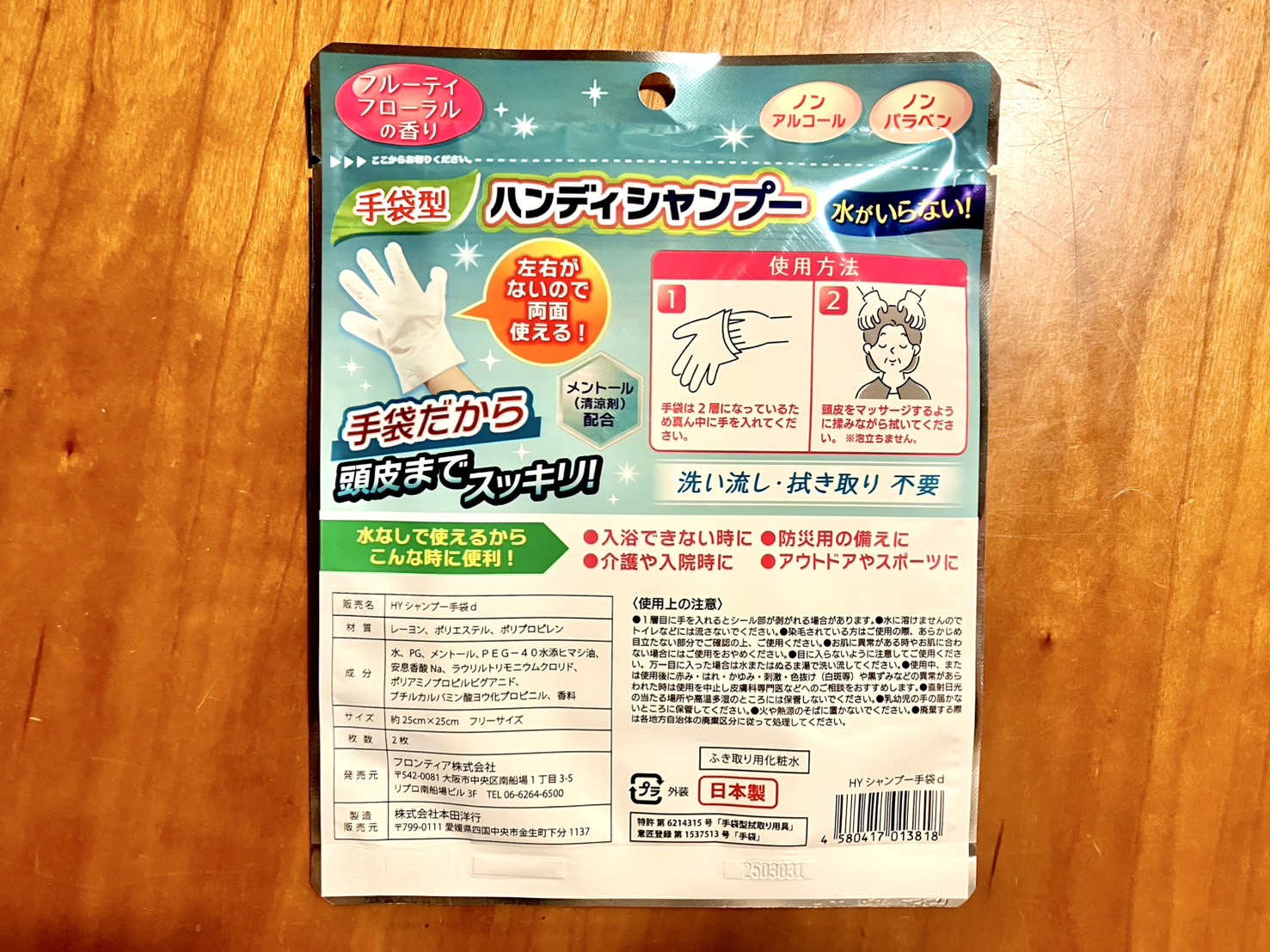 こちらの商品、なんと手袋に水のいらないシャンプーが染みこんでいるらしい。