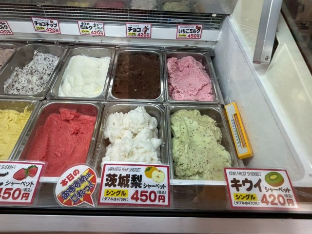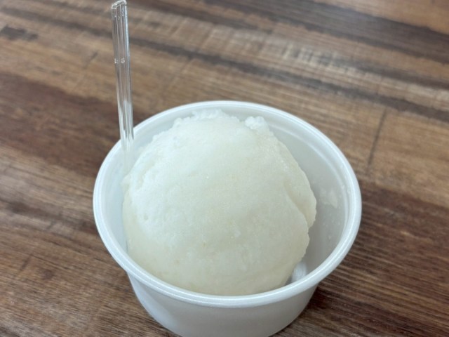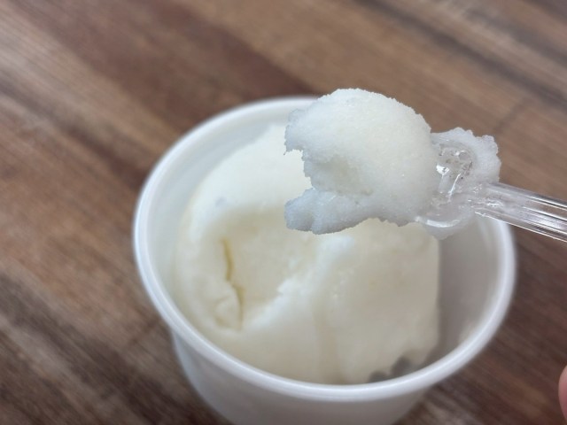 揚げそばを食べ終えたあと、さっぱりしたものが欲しくなり、同じ道の駅で販売していた梨のシャーベット(450円)を注文した。これが大正解。