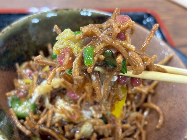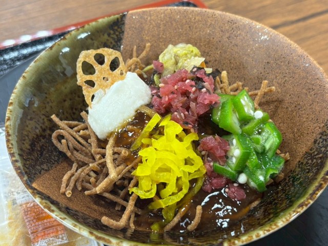 五霞町産の常陸秋そばを油で揚げてあり、そこに白菜、れんこん、大根、人参、オクラといった茨城県産野菜をふんだんに使った和風あんがかかっている。