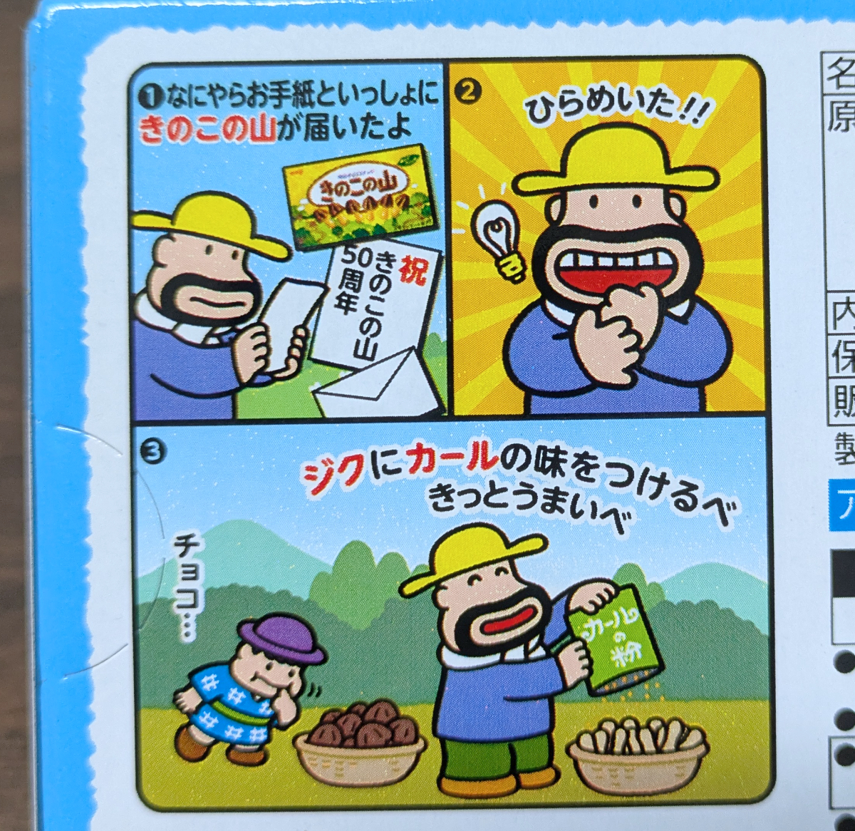 裏面を見ると、この商品誕生の経緯が漫画で書かれていた。それによると、カールおじさんの元にきのこの山が届いたそうだ。そしておじさんは閃く。チョコを外した軸に、粉を振りかける。