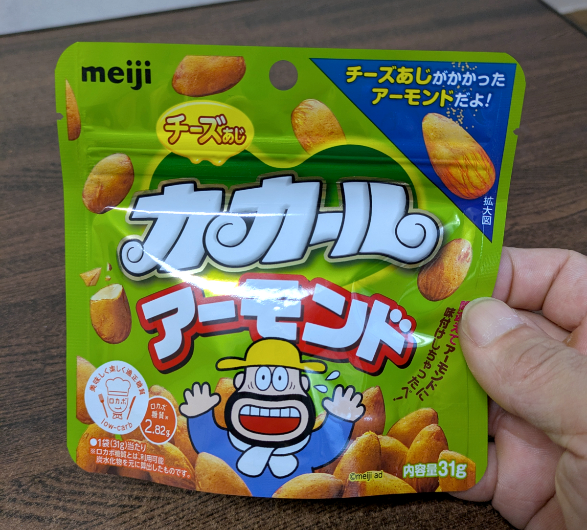 それからもう1つ。これはカールのチーズ味がかかった「カカールアーモンド」(税込237円)というそうだ。カールがカカールか、ハハハ……。