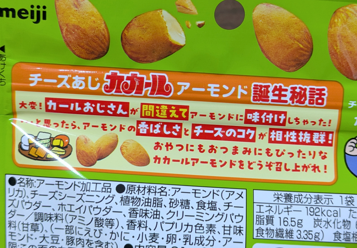 これの誕生秘話はこうだ。「カールおじさんが間違えてアーモンドに味つけしちゃった!」とのこと。