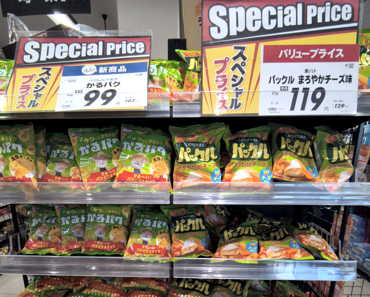 スナック菓子コーナーを覗いてみて私は驚いた。右にパックル、左にかるパク。こんな棚の作り方あるか!? 自社の商品と類似商品を戦わせているような陳列に、度肝を抜かれてしまった。しかもパックル税込129円に対して、かるパクは107円。この置き方なら、かるパクの方が売れるんじゃないのかなあ?