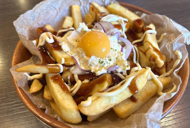 「月見てりたまマヨポテト」はフライドポテトに甘辛いオリジナルてりやきソース、マヨネーズ、たまごサラダ、卵黄を乗せたもの。
